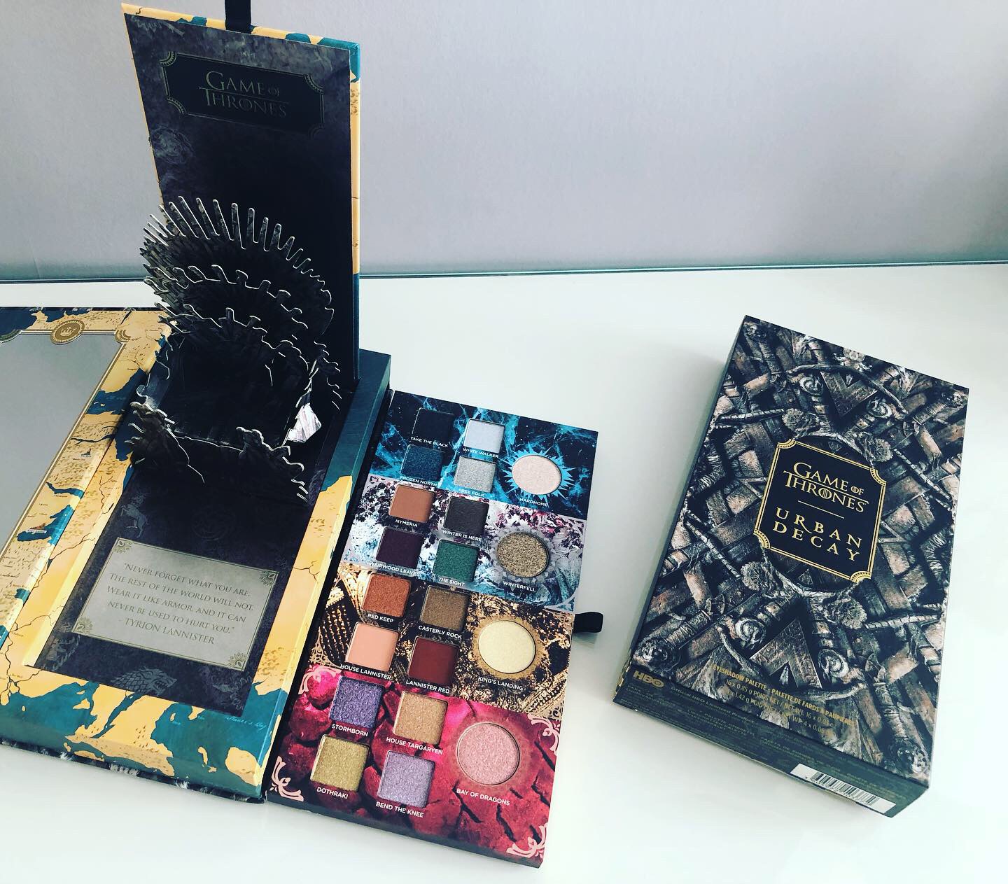 Urban Decay a mit la barre haute, rien qu’ avec le packaging qui recrée le trône de fer, on peut également retrouver la citation de Tyrion Lannister